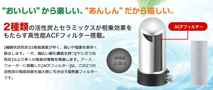 3種類のセラミックスをパウダー化し、塩素除去・脱臭・不純物除去能力に優れたACF成形体に練り込んでいます。